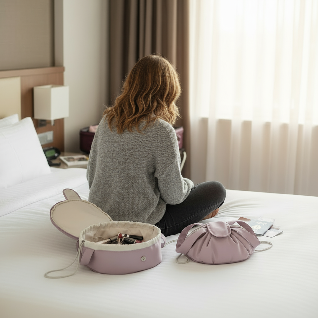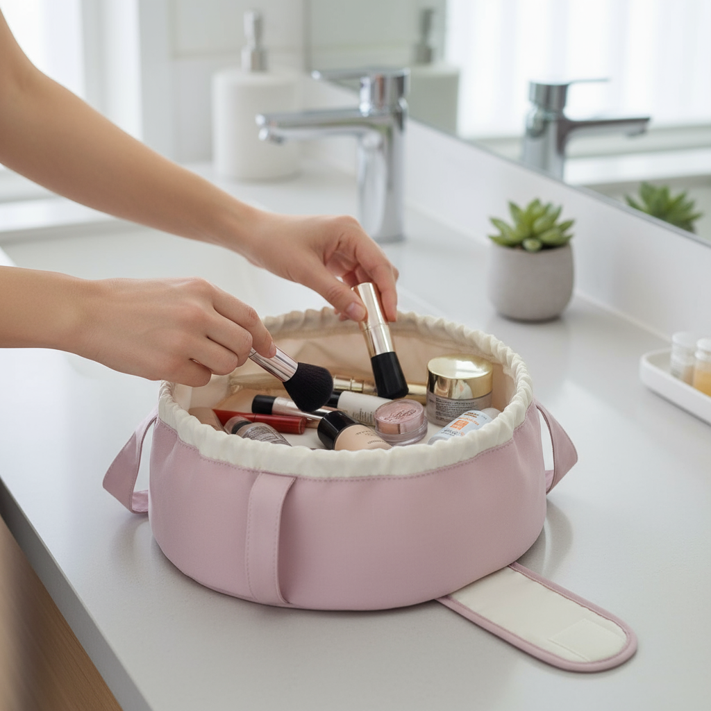 Praktisk och rymlig sminkväska med dragsko som rymmer smink, hudvårdsprodukter och andra hygienartiklar. Perfekt för resor, vardag eller som organiserare hemma.